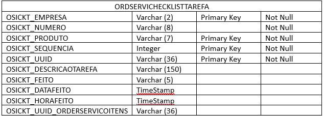 Na tabela ORDSERVI já existente, foi adicionado o campo OSI_IDCHECKLISTOS do tipo Integer.