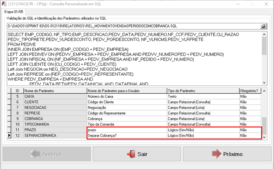 Situação Identificada: Durante o processo de emissão da NFC-e, quando o cliente confirmava a emissão selecionando “SIM”, o sistema imprimia apenas a NFC-e, sem perguntar se o pedido (não fiscal) também deveria ser impresso — mesmo com o parâmetro 4.18.276 = “Sim”. Além disso, o cliente relatou que o relatório Movimento de Vendas no Período com Cobrança não estava sendo gerado corretamente, apresentando erro ao tentar emitir o documento (Imagem02).