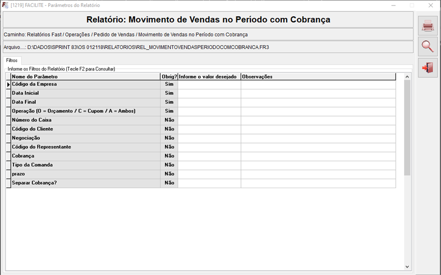 Solução Implementada: Criação de novo parâmetro: Foi criado o parâmetro 4.18.781 – “Imprimir pedido junto com emissão de NFC-e no Balcão” no aplicativo Util. Quando este parâmetro estiver configurado com o valor “Sim”, o sistema realizará a impressão do pedido automaticamente junto à emissão da NFC-e no aplicativo Balcão. Correção do relatório: Foi tratado o problema no relatório Movimento de Vendas no Período com Cobrança, localizado no menu: Relatórios Fast → Operações → Pedido de Vendas Arquivo: REL_MOVIMENTOVENDASPERIODOCOMCOBRANCA.fr3 A falha que impedia a geração do relatório foi corrigida, garantindo seu funcionamento normal.