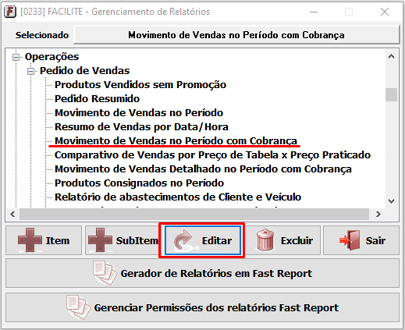 Relatório: Para configurar corretamente o relatório, é necessário configura-lo no Integrado: na tela de gerenciamento, localize o relatório ‘Movimento de Vendas no Período com Cobrança’, selecione e clique no botão editar.