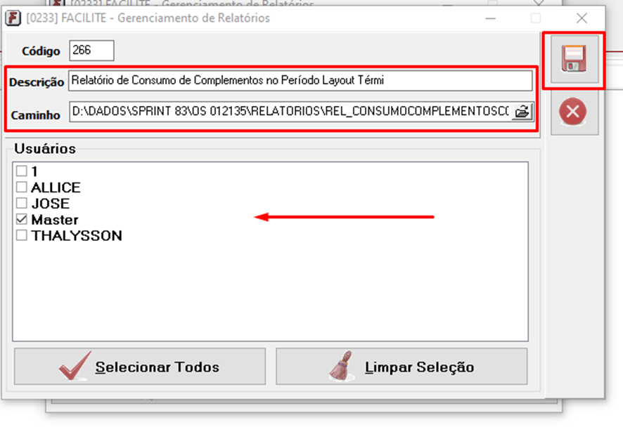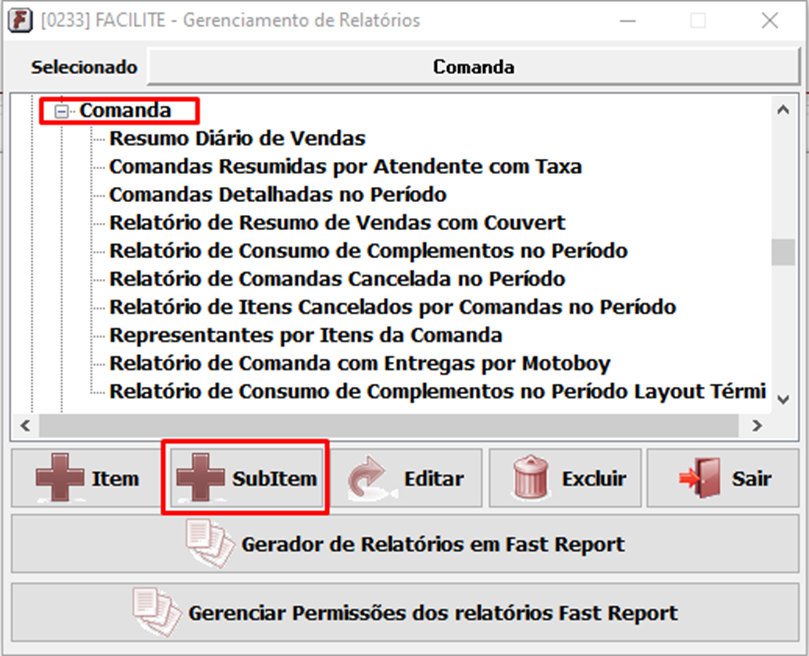 Colunas do Relatório • Empresa • Complemento • Quantidade • Vlr. Total O relatório também possui totalizadores finais, permitindo análise completa. ________________________________________ ⚙️ Configuração Para que o relatório funcione corretamente, deve-se realizar a seguinte configuração: ________________________________________ Tela de Gerenciamento de Relatórios, crie o subitem no estoque com o nome ‘Relatório de Consumo de Complementos no Período Layout Térmico’: