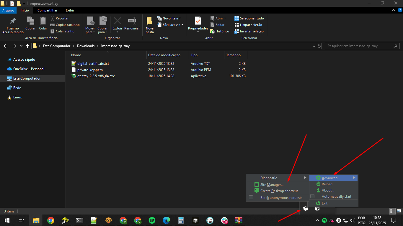 3. Clique no ícone do QZ Tray na bandeja. Vai abrir uma pequena janela. Entre em Advanced → Site Manager.