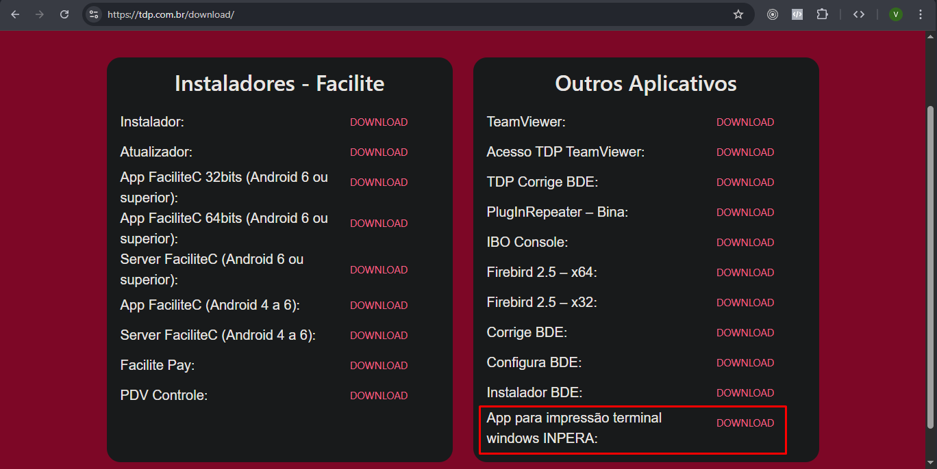 1. No link "https://tdp.com.br/download/" clique para baixar o "App para impressão terminal windows INPERA".