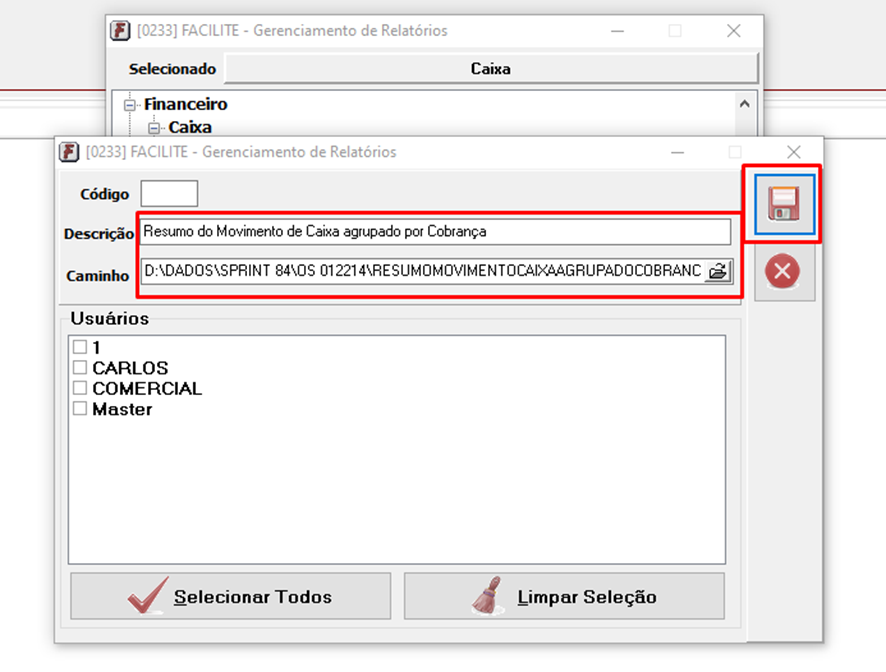 Na tela a seguir, Coloque o nome do novo relatório ‘Resumo do Movimento de Caixa agrupado por Cobrança’, no campo Caminho, busque o arquivo dentro do diretório. Adicione os Usuários e Clique em Gravar