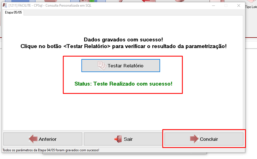 Após realizar o teste, a Mensagem deverá ser ‘Status: Teste Realizado com Sucesso!’, clique em concluir e seu relatório estará dentro das configurações: Resumo do Movimento de Caixa Agrupado por Cobrança: Relatórios Fast-> Financeiro-> Caixa-> Resumo do Movimento de Caixa Agrupado por Cobrança