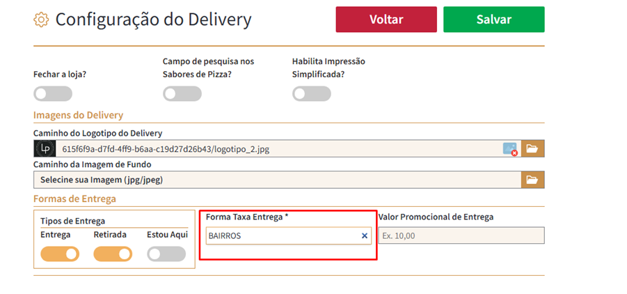 configurar a taxa de entrega por bairros no módulo de Delivery, permitindo que