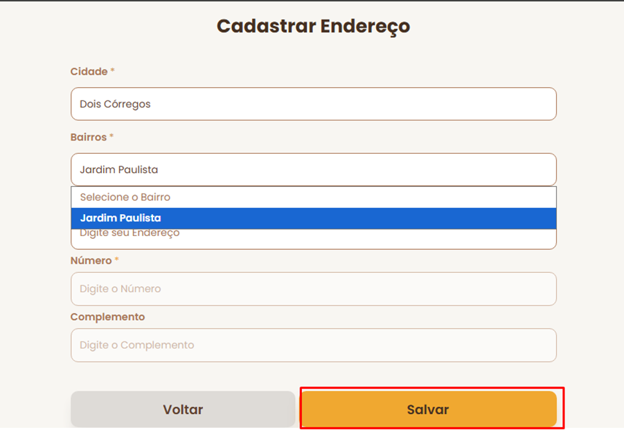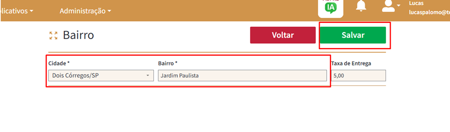 6. Preencher os campos Cidade, Bairro e Taxa de entrega (se aplicável) e, em