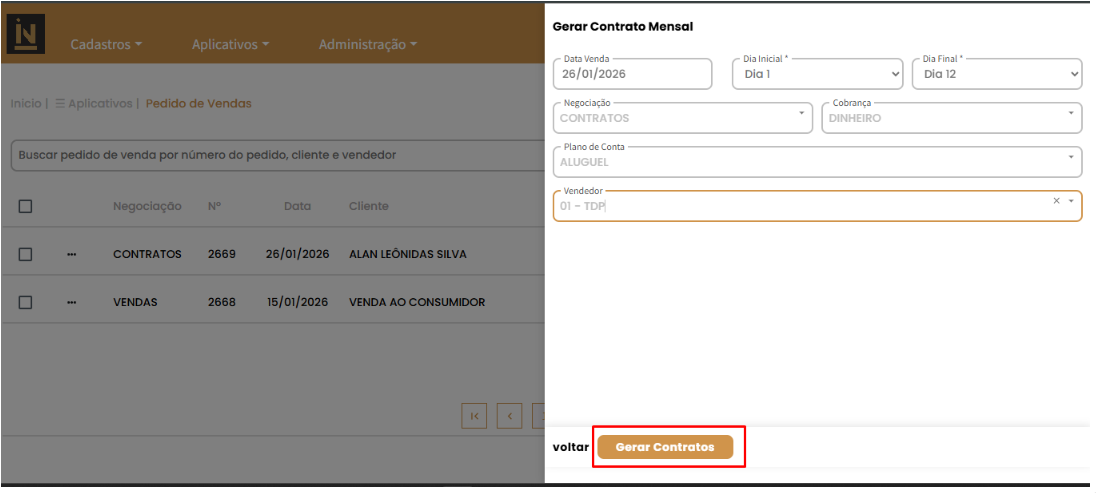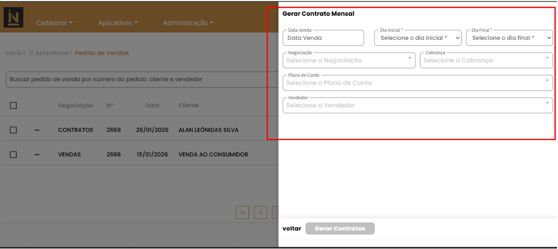 A funcionalidade utiliza como origem os dados definidos na seção Contratos do cadastro do cliente, considerando produto, valor e dia de vencimento, gerando pedidos conforme o período selecionado pelo usuário.