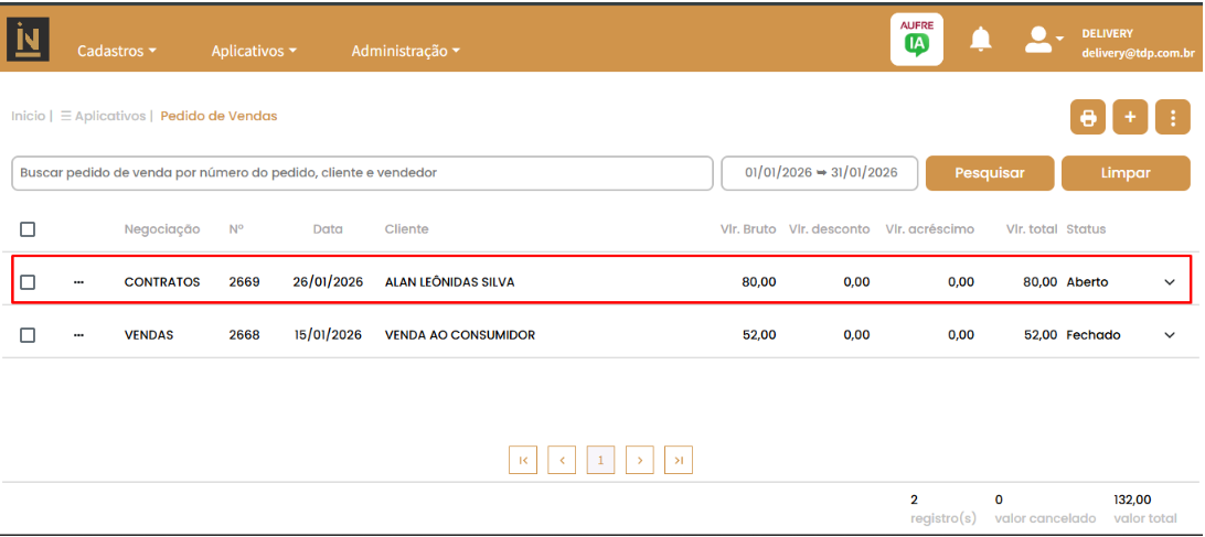 1. Acessar o menu Aplicativos > Pedido de Vendas