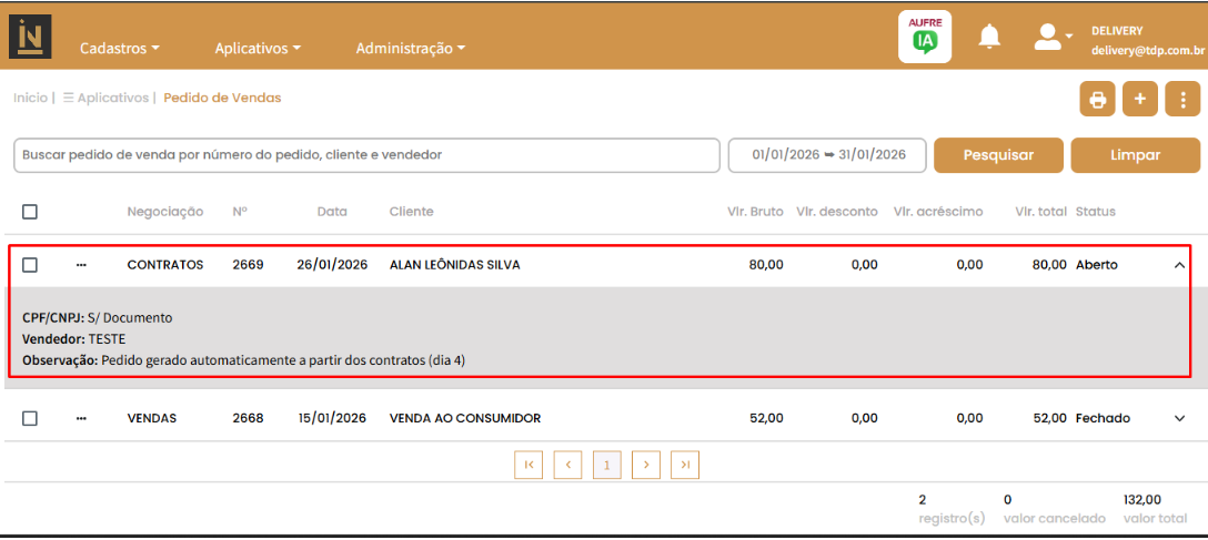 Após a execução, o sistema retorna para a tela de Pedido de Vendas exibindo os novos pedidos criados automaticamente (Imagem 5).