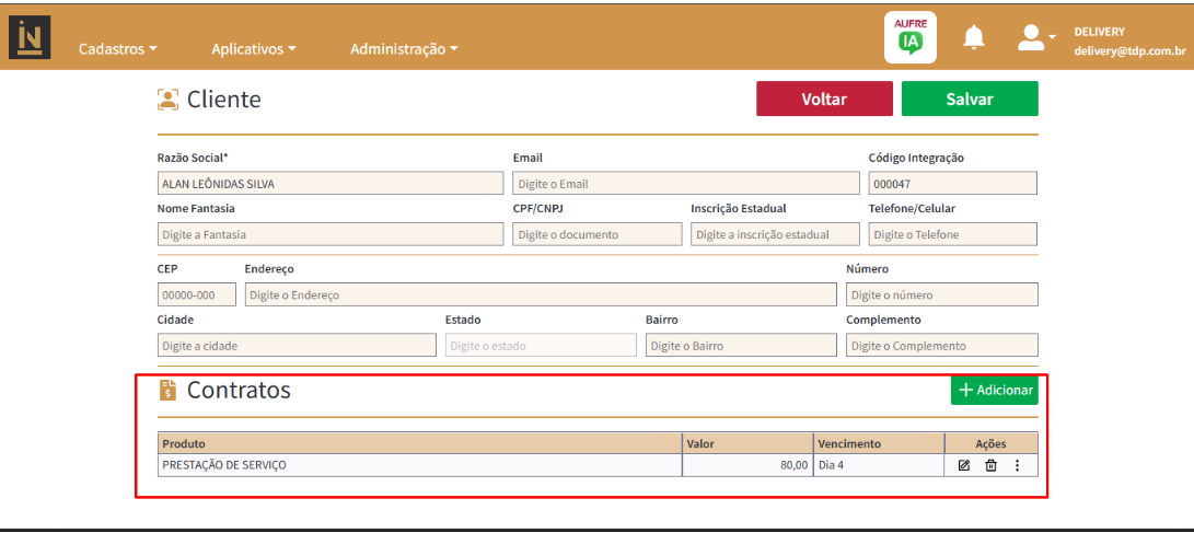 Os dados utilizados para a geração automática são provenientes da seção Contratos existente no cadastro do cliente (Imagem 7), localizada na parte inferior da tela de Cadastro/Edição de Clientes.