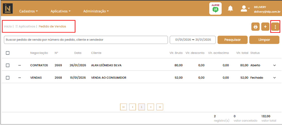 2. Na tela de listagem de pedidos, clicar no botão de menu de ações (ícone de três pontos) localizado no canto superior direito da tela (Imagem 1)