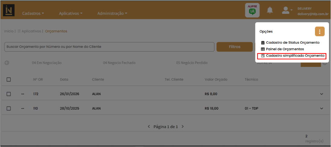 3. Selecionar a opção Cadastro simplificado Orçamento (Imagem 2)