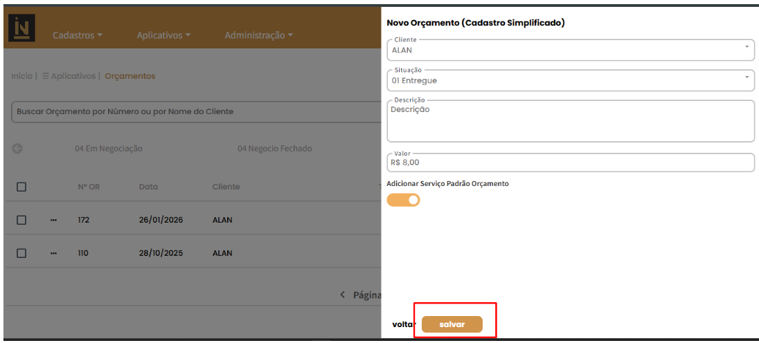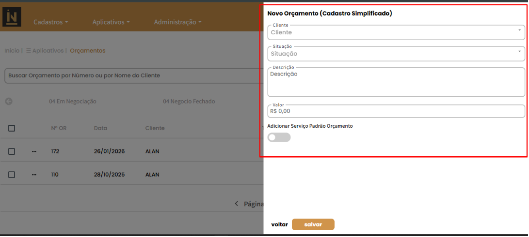A funcionalidade centraliza os principais campos necessários para o lançamento inicial do orçamento, como cliente, situação, descrição e valor, com a opção adicional de incluir automaticamente um serviço padrão.
