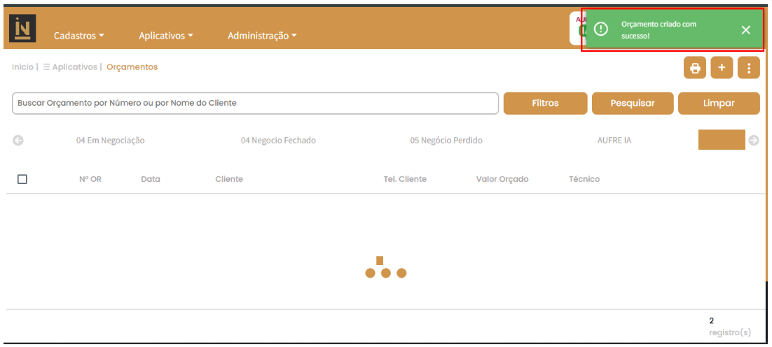 Após o salvamento, o novo orçamento passa a aparecer imediatamente na listagem principal de orçamentos (Imagem 6), apresentando: