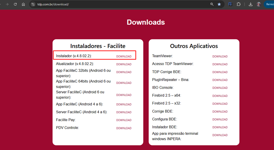 de execução (BDE). Site do instalador: https://tdp.com.br/download/ PROCEDIMENTO: Realize o download do arquivo “Instalador.exe” no site oficial da